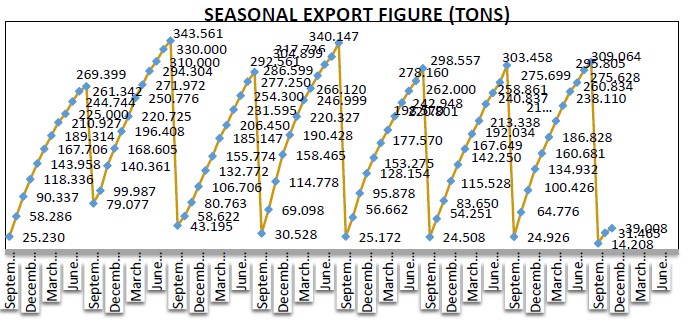 16.11.2025 tarihi itibariyle 39.008,- ton ihracat gerçekleşmesi olup, 2024/25 sezonunda aynı tarih itibariyle 83.628,-ton, 2023/24 sezonunda aynı tarih itibariyle 70.455.-ton olarak gerçekleşmişti. Aşağıdaki grafikte ayrıntılara yer verilmiştir.