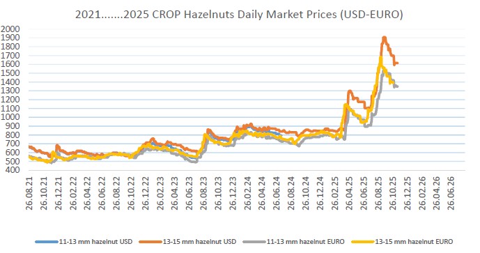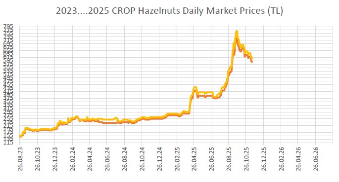 Rekolte beklentilerinin 400 bin civarında beklenmesi 15/08/2025 tarihinden itibaren fiyatları çok hızlı yükselterek 11-13 mm naturel iç fındıkta 12.000 USD (10.300 Euro) seviyelerinden, 18/09/2025 tarihinde 18.100 USD (15.300 Euro) seviyelerine kadar yükselti. Daha sonra büyük alıcının başka menşeilere yönelik alımı ve TL faiz maliyetlerinin yüksek olması sebebi ile 730 TL/Kg seviyelerine kadar çıkan fiyatlar, bu günlerde 590 TL/Kg seviyelerine kadar düştü. Büyük alıcı, Rekabet Kurumu ile yapmış olduğu anlaşma gereğince, geçen hafta yaklaşık 35.000 ton kabuklu fındık alımı gerçekleştirdi.